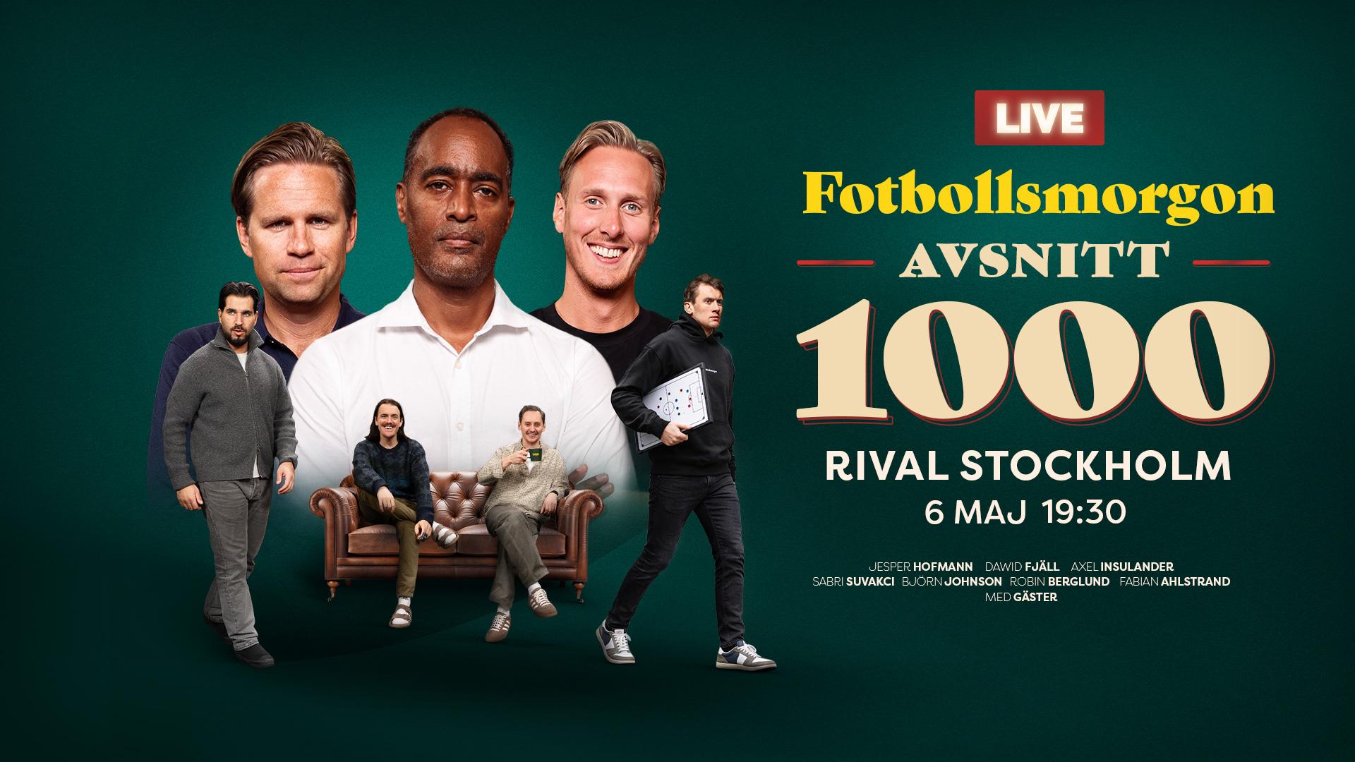 Efter fyra år och 1000 avsnitt kliver Fotbollsmorgon ut ur studion och upp på Rival den 6 maj 2026. Axel Insulander, Jesper Hofmann och hela gänget firar med publiken – med nostalg...